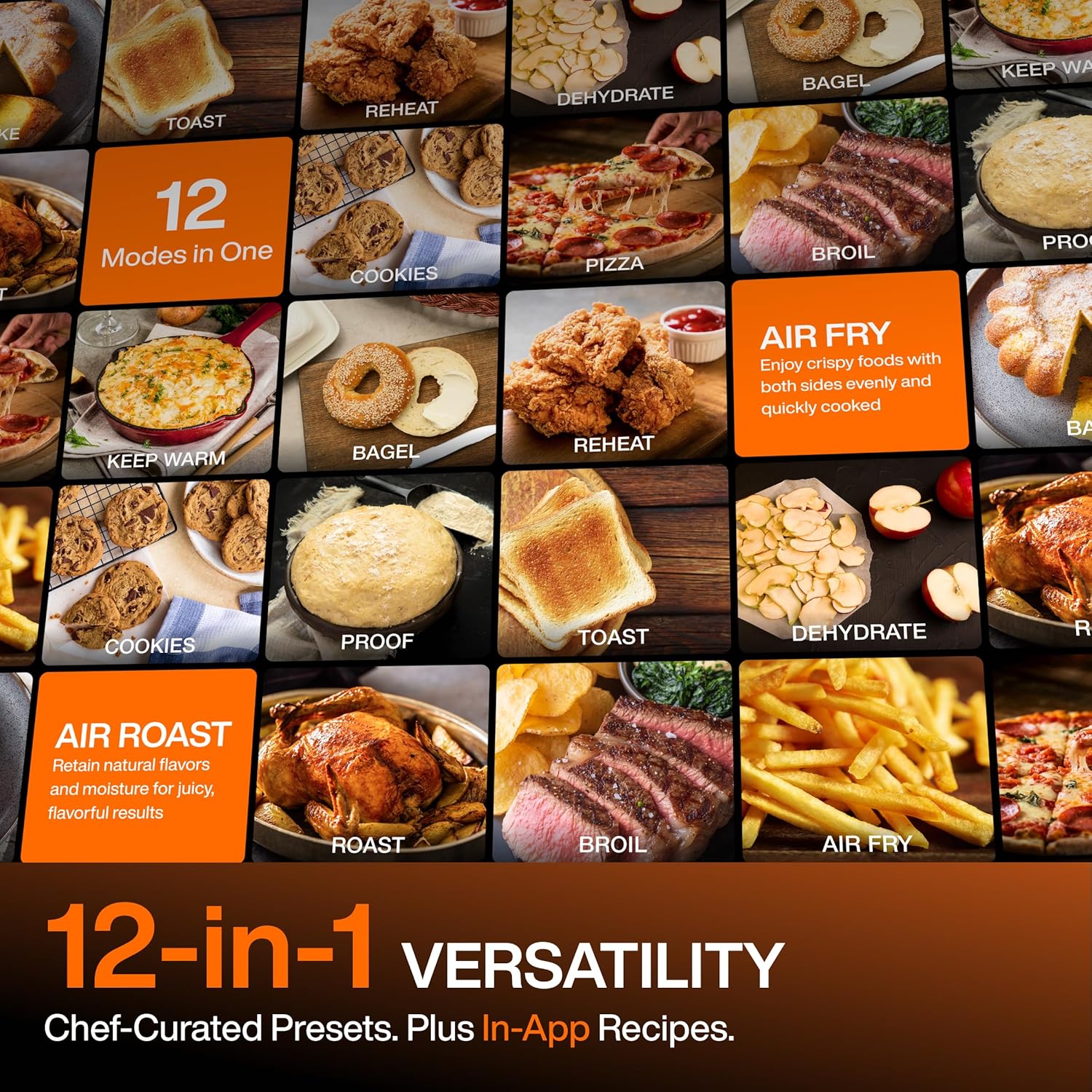 𝟏𝟐-𝐢𝐧-𝟏 𝐂𝐨𝐨𝐤𝐢𝐧𝐠 𝐕𝐞𝐫𝐬𝐚𝐭𝐢𝐥𝐢𝐭𝐲: With a wide temperature range of 85–450℉ and 3 fan speeds, the oven offers 12 cooking modes (Roast, Bake, Air Fry, Broil, Pizza, Cookies, Toast, Bagel, Proof, Reheat, Dehydrate, Keep Warm) and 5 probe presets (Beef, Fish, Pork, Lamb, Poultry). Access approximately 35 step-by-step app recipes plus 15 printed recipes, with app recipes continuously updated for inspiration and guidance.