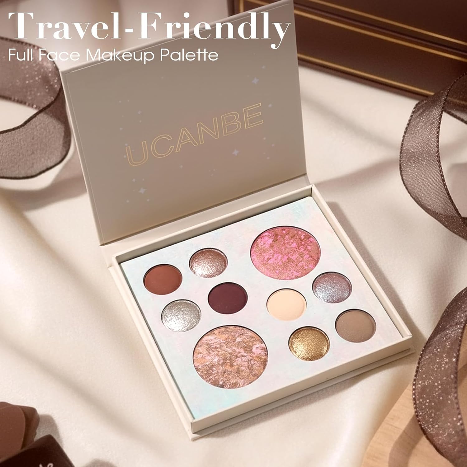 UCANBE All in One Baked Makeup Palette – Eyeshadow, Blush & Bronzer Face Kit, Neutral Pigmented Colors, Travel Size Compact, Full Face Makeup Gift Set for Women