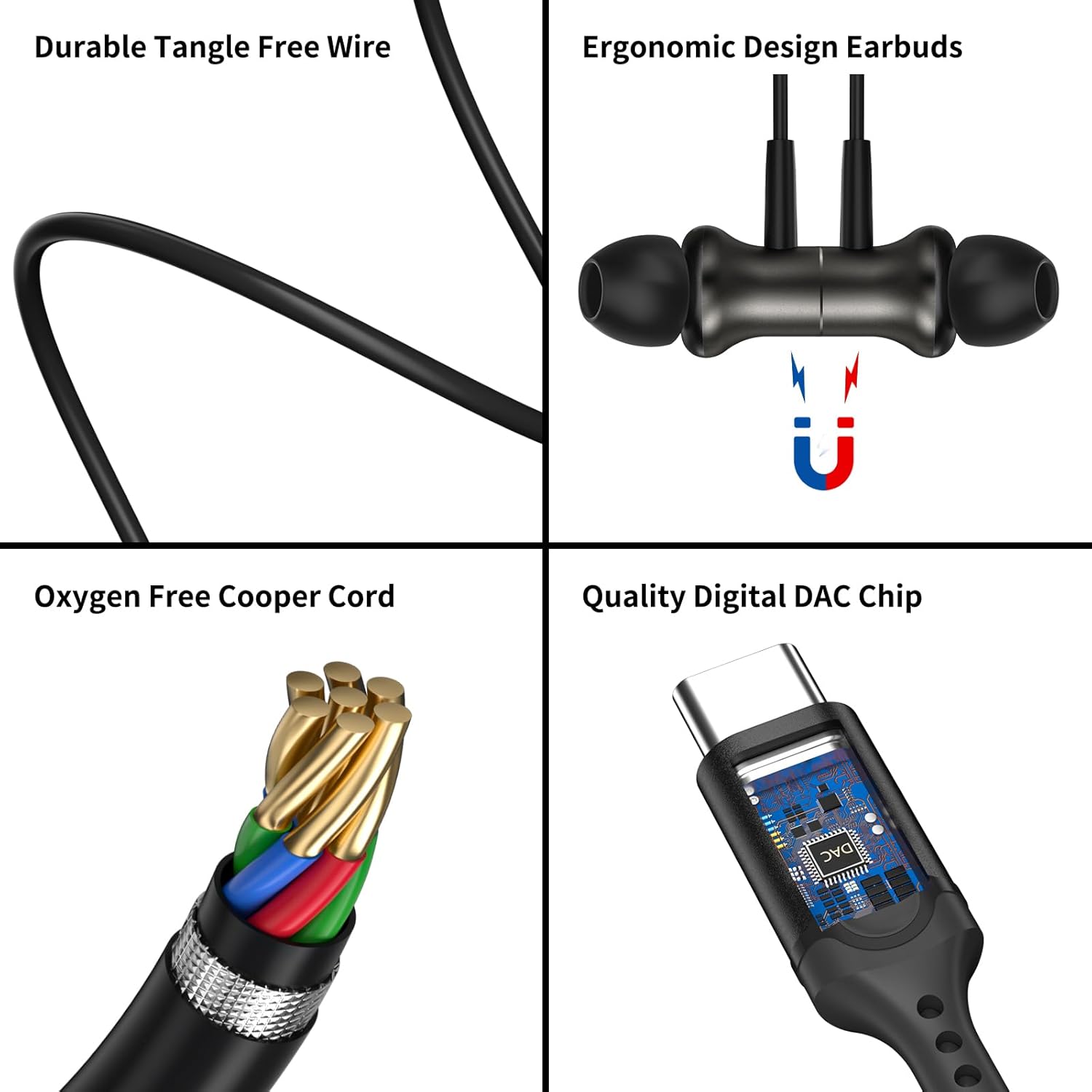 Upgraded Magnetic USB C Headphone: The joint between the wired and the USBC connector is strengthened to withstand bends in every day use. It will last longer and uneasy to break than other wired earphones in the market. Earbuds designed with magnetic metal casing, looks stylish than the plastic earbuds, magnetic design allows you to tab the earbuds around your neck for convenient wearing and tangle free experience