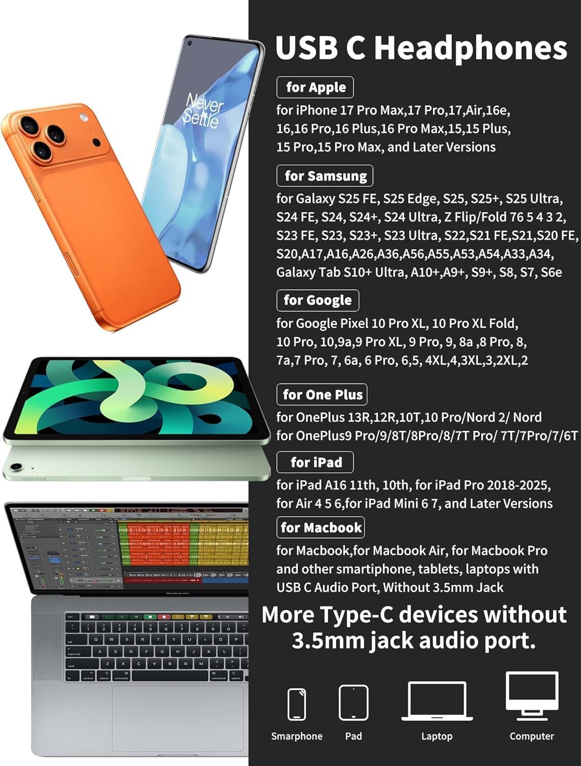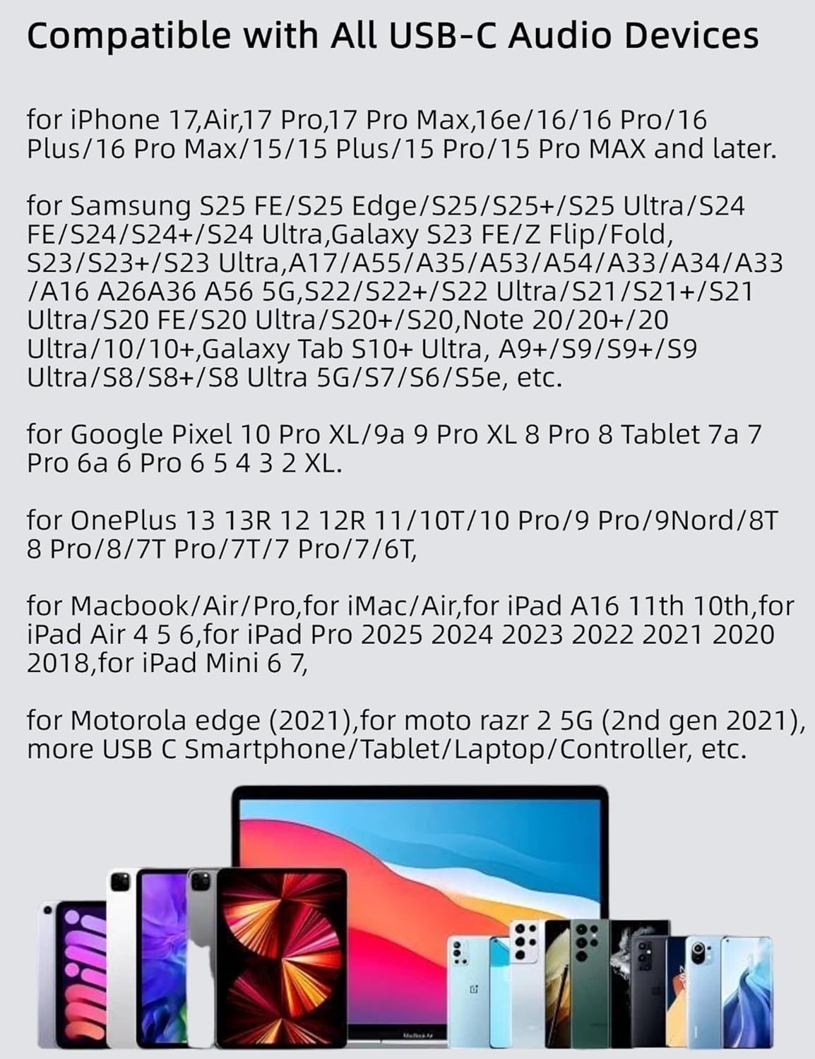 for USB C Smartphone/Tablet/Laptop/Controller,for iPhone 17,Air,17 Pro,17 Pro Max,16e/16/16 Pro/16 Plus/16 Pro Max/15/15 Plus/15 Pro/15 Pro MAX, for Samsung S25 FE/S25 Edge/S25/S25+/S25 Ultra/S24 FE/S24/S24+/S24 Ultra,for Google Pixel 10 Pro XL/9a 9 Pro XL 8 Pro 8 Tablet 7a 7 Pro 6a 6 Pro 6 5 4 3 2 XL,Galaxy S23 FE/Z Flip5/Fold5/4/3/2/6, S23/S23+/S23 Ultra,A17/A55/A35/A53/A54/A33/A34/A33/A16 A26 A36 A56 5G,S22/S22+/S22 Ultra/S21/S21+/S21 Ultra/S20 FE/S20 Ultra/S20+/S20,Note 20/20+/20 Ultra/10/10+,Galaxy Tab S10+ Ultra, A9+/S9/S9+/S9 Ultra/S8/S8+/S8 Ultra 5G/S7/S6/S5e,for OnePlus 13 13R 12 12R 11/10T/10 Pro/9 Pro/9/Nord/8T/8 Pro/8/7T Pro/7T/7 Pro/7/6T,for Macbook/Air/Pro,for iMac/Air,for iPad A16 11th 10th,for iPad Air 4 5 6,for iPad Pro 2025 2024 2023/2022/2021/2020/2018,for iPad Mini 6 7 ,for Motorola edge (2021),for moto razr 2 5G (2nd gen 2021),more type c audio devices