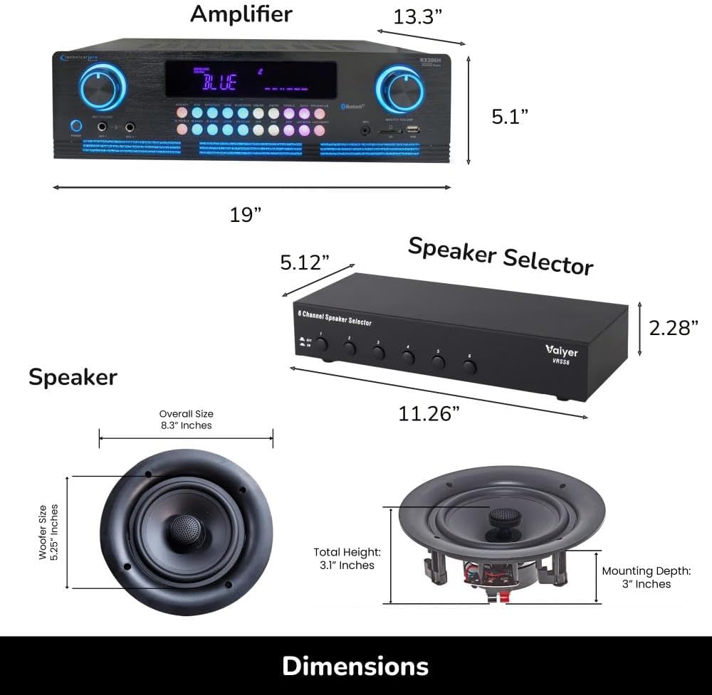 Specification: Vaiyer Home Theater Sound System Kit – 2000 W Bluetooth Amplifier w/ 12 Qty of 5.25″ Frameless Ceiling Speakers 175 W Each, 6-Ch Speaker Selector, 500 ft Speaker Wire & Remote for Home, Restaurant