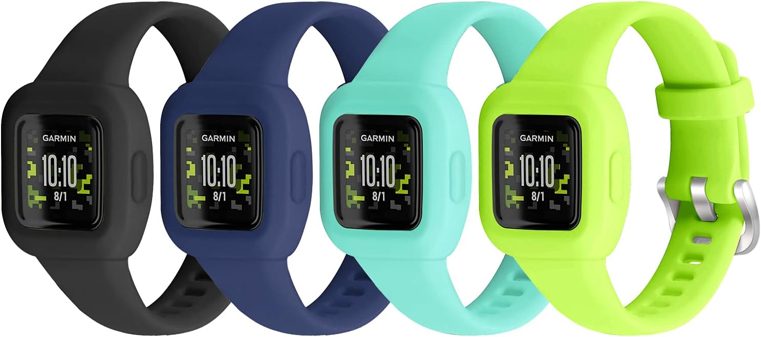 Vanet 4 Pack Compatible with Garmin Vivofit Jr 3 Bands for Kids, Soft Silicone Sport Breathable Bands Adjustable Replacement for Girls Boys, Black/Navy/Lime/Teal Green
