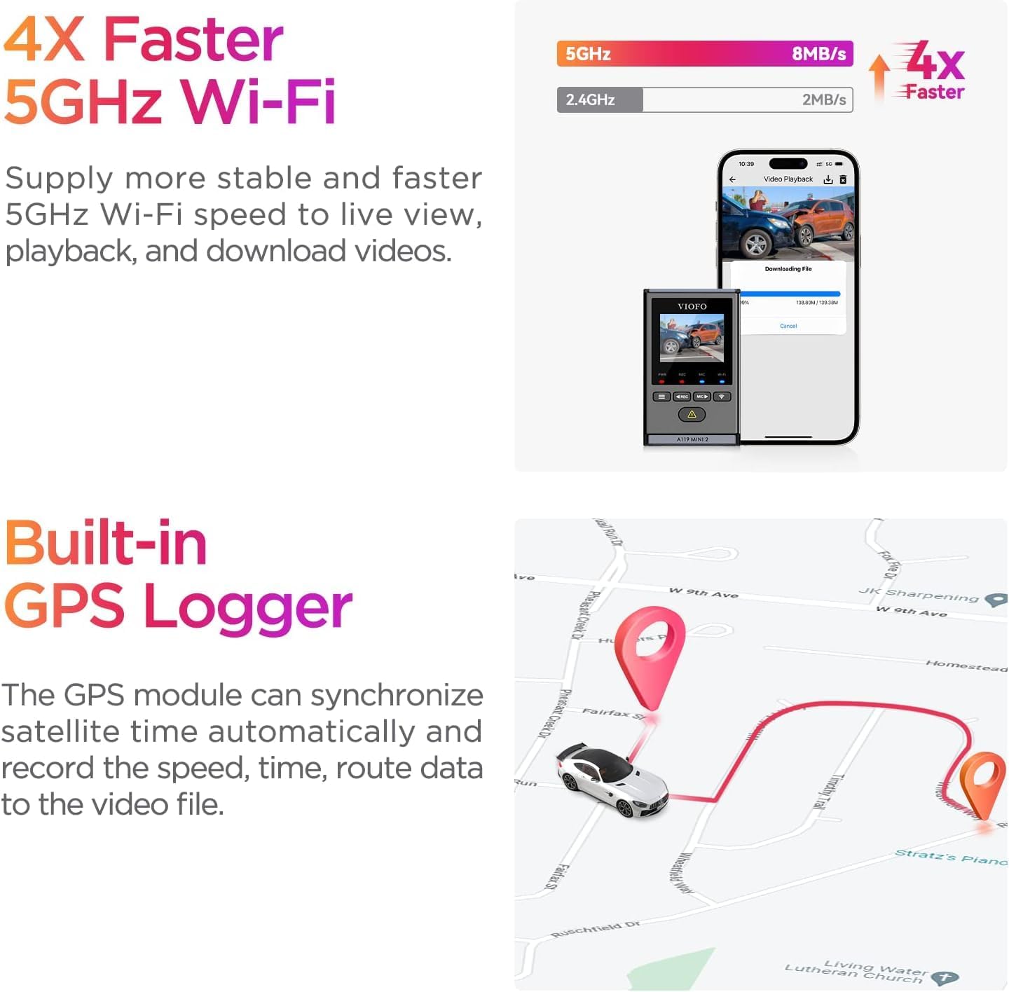 【Faster 5GHz Wi-Fi & GPS】VIOFO 2K dash cam A119 Mini 2 supports upgraded 5GHz Wi-Fi to provide 4 times faster file transfer. Connect the dashcam to your iOS & Android phones via the VIOFO app and you can live view, playback, download videos, or adjust settings, making it simple to access, store, and send over video evidence in case of any incident. Built-in GPS module can automatically synchronize satellite time and record driving route, speed, and time data into the video files.