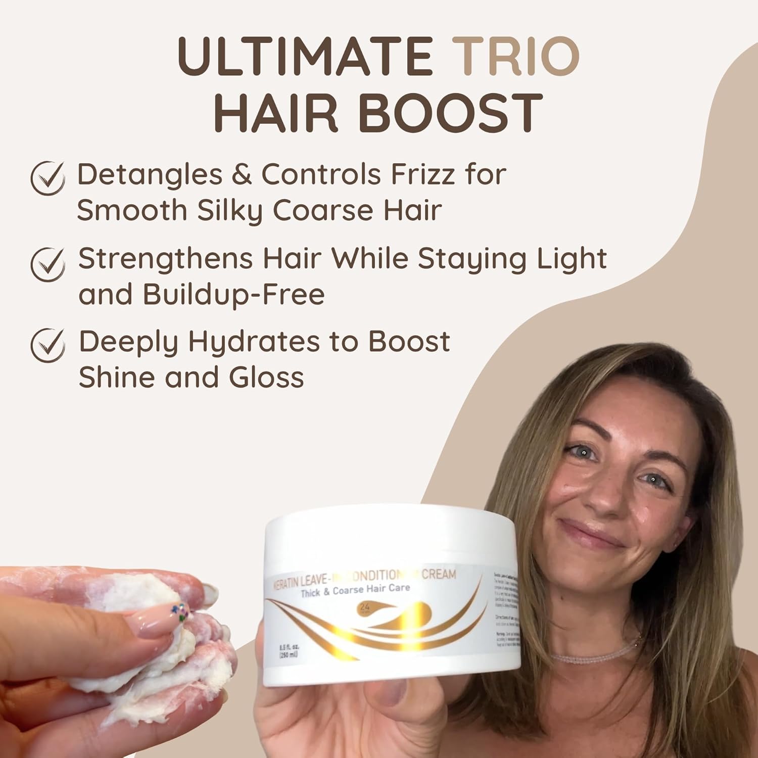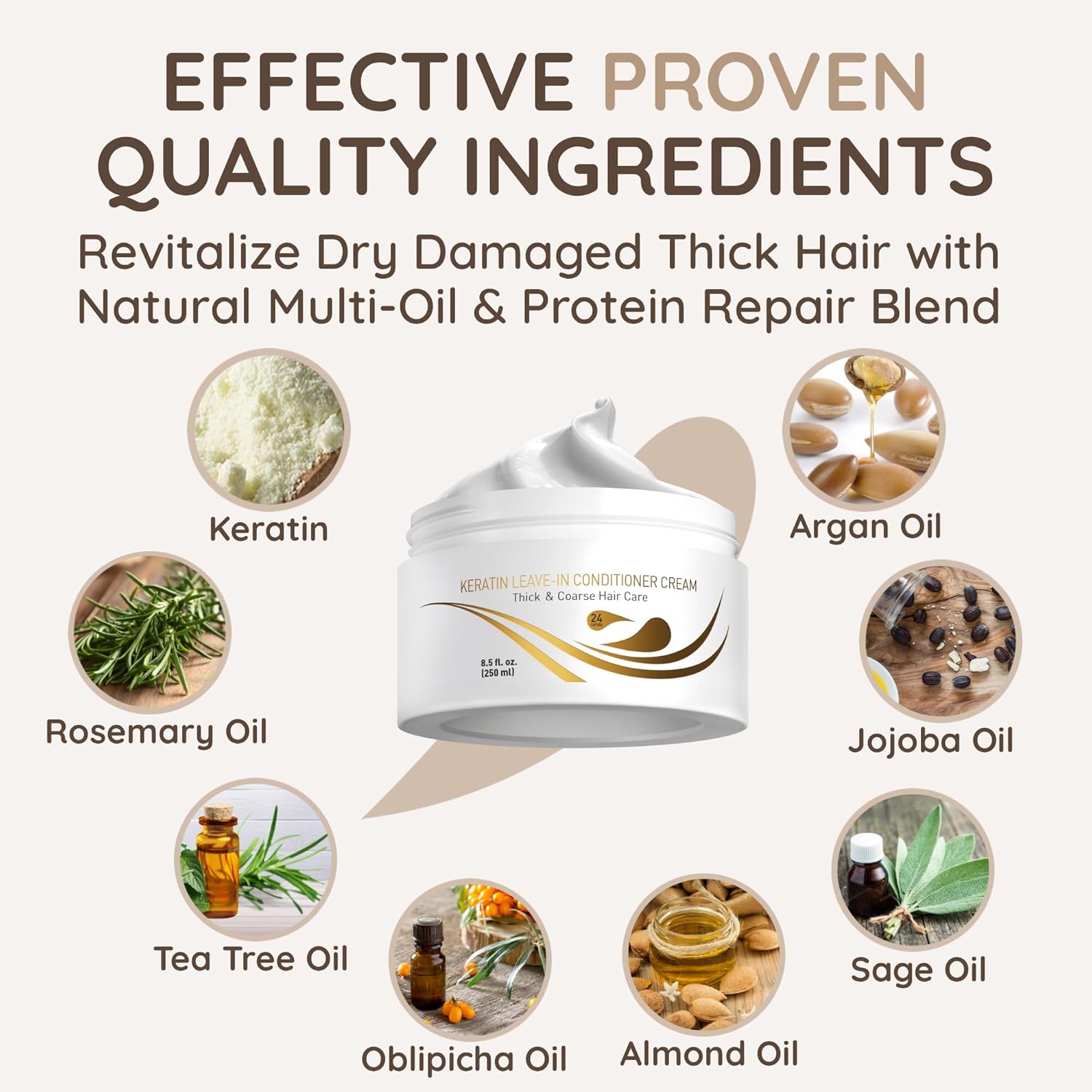 Keratin Leave-In Conditioner for Thick Coarse Dry Damaged Hair boosts volume, shine and strength. Hydrates, tames frizz, detangles, and protects from heat. Sulfate-free, keratin-rich and ideal for color-treated, dull, or fragile hair. Adds body and leaves hair silky, shiny, rich and full