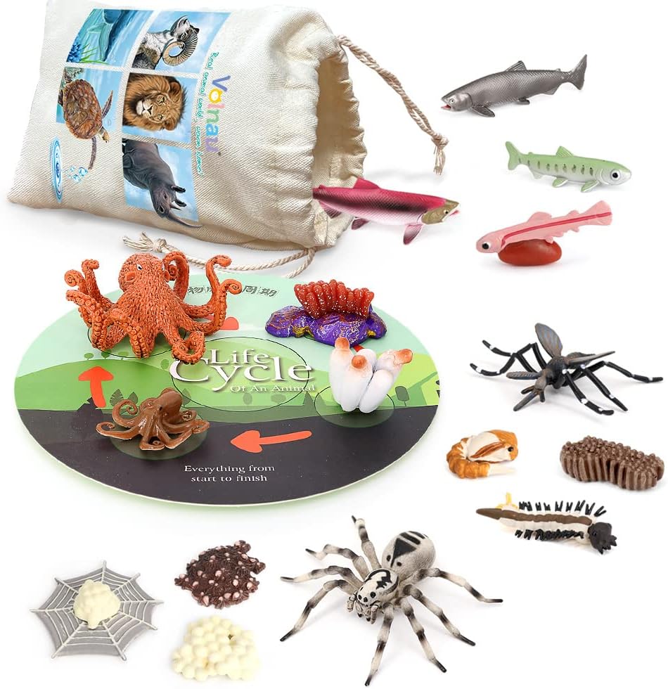 Volnau Animal Figurines Toys 17PCS Life Cycle Figure Set for Toddlers Kids Salmon Octopus Wolf Spider Mosquito Christmas Birthday Gift Preschool Educational Prop