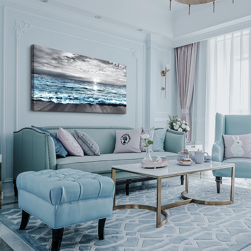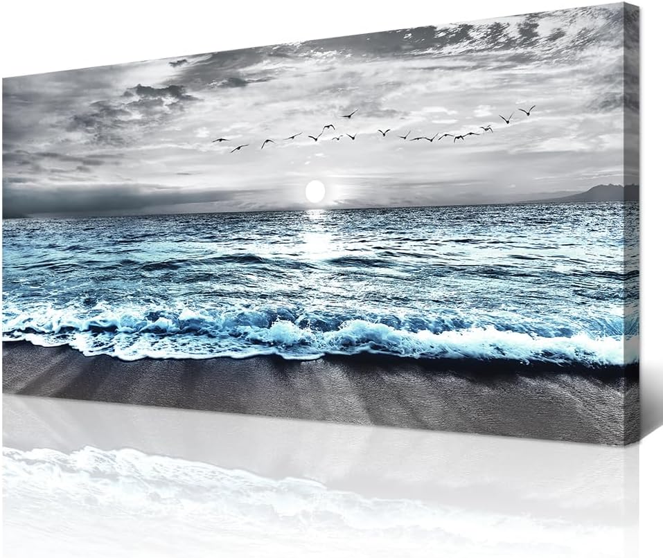 Wapluam Large Canvas Wall Art For Living Room & Bedroom Decor – Black & White Blue Sea Wave Pictures – Framed Beach Posters