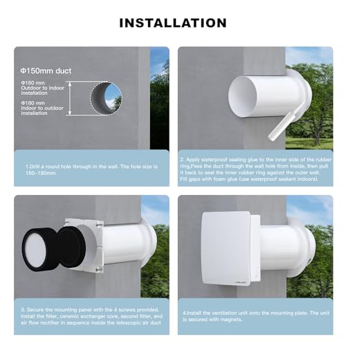 Wall Mounted Ventilation for Multiple Rooms Designed for easy through-wall installation with an adjustable duct, this wall mounted exhaust fan is suitable for bedrooms, bathrooms, basements, garages, tiny homes, and other enclosed spaces.