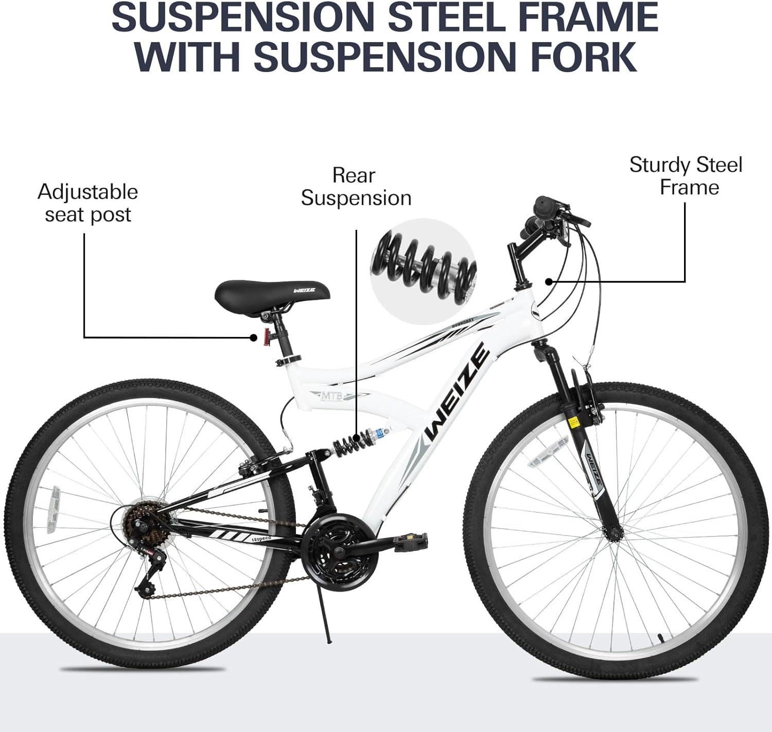 【Frame】: Durable steel dual suspension Mountain Bike frame. Featured with Front suspension fork and rear coil shock to smooth out the bumps along the way.