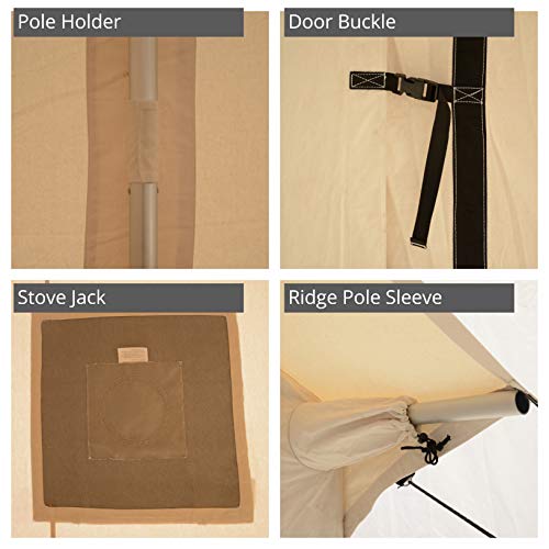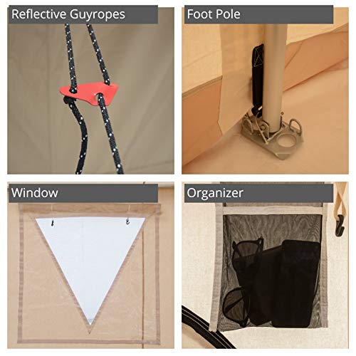 INTERIOR FEATURES: Our 4 season camping tents are spacious enough to accommodate large group of people, families and friends making them ideal tents for camping. Durable 3-layer large triangular distinctive windows come with clear polyvinyl flap with a durable Velcro fastening system for letting in natural light without losing the heat from your stove, better ventilation and clear views. All the seams are double stitched, corners are reinforced for added strength