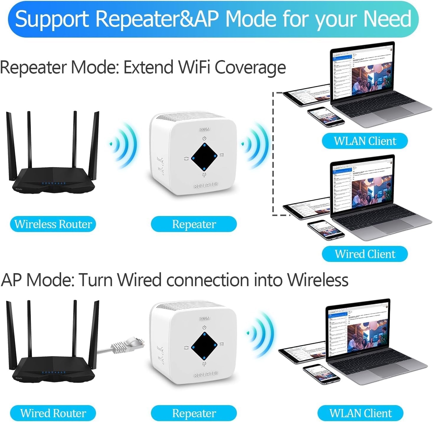 Repeater Mode/AP Mode: Wi-Fi Extender has Repeater/AP mode, Ethernet Port can easily turn your wired Internet connection into a access point. most home users will set it up in one of two ways: Range extender (it connects to your existing network and enhances/extends the signal) or Access Point (it connects to the Internet or your existing network via Ethernet and then broadcasts the wifi signal.