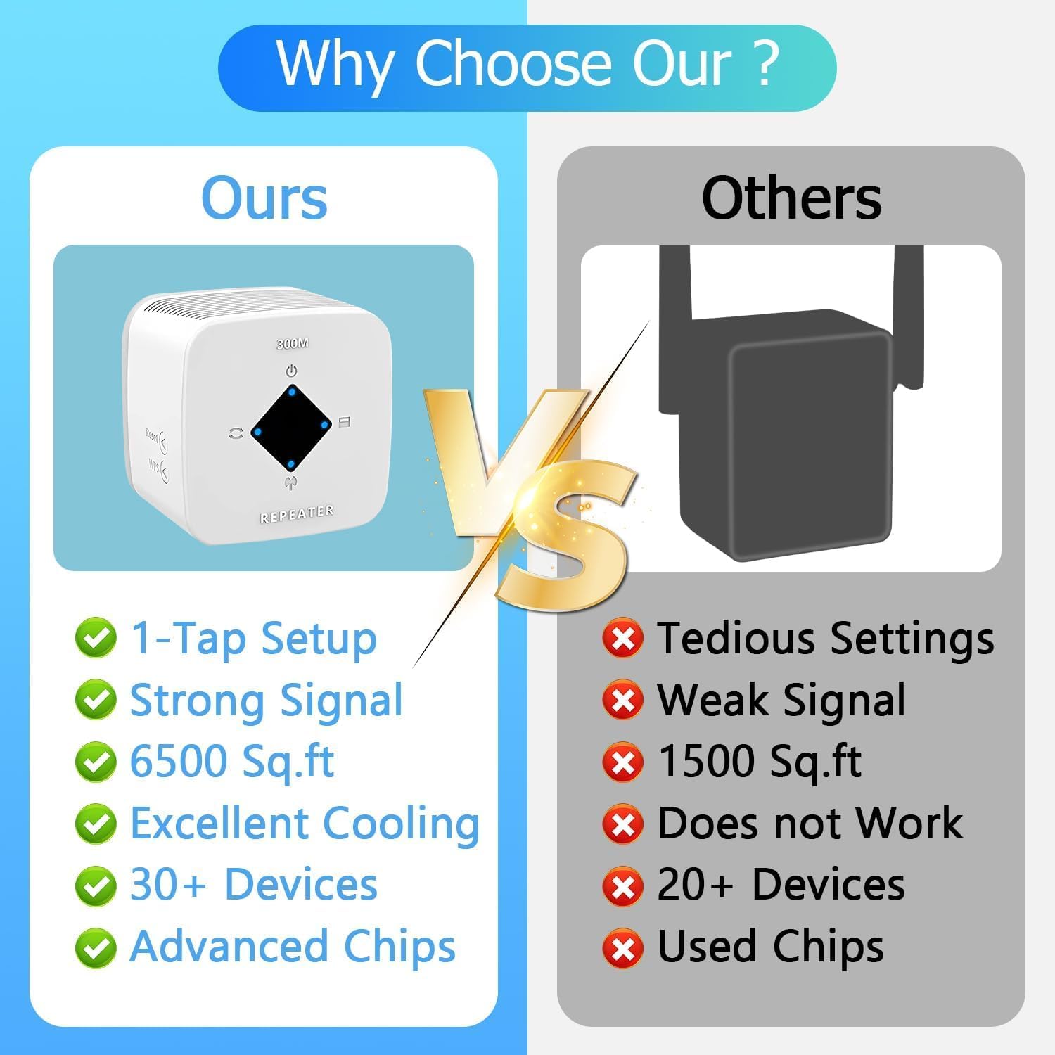 Up to 6500 Sq.Ft: Never get stuck behind thick walls, appliances and cement floors, Delivers ultra-stable bandwidth for online gaming, video conferences and even streaming 4K HD videos.Spots in rooms,basement,garage,bedroom with weak wifi coverage with our wifi range extender.