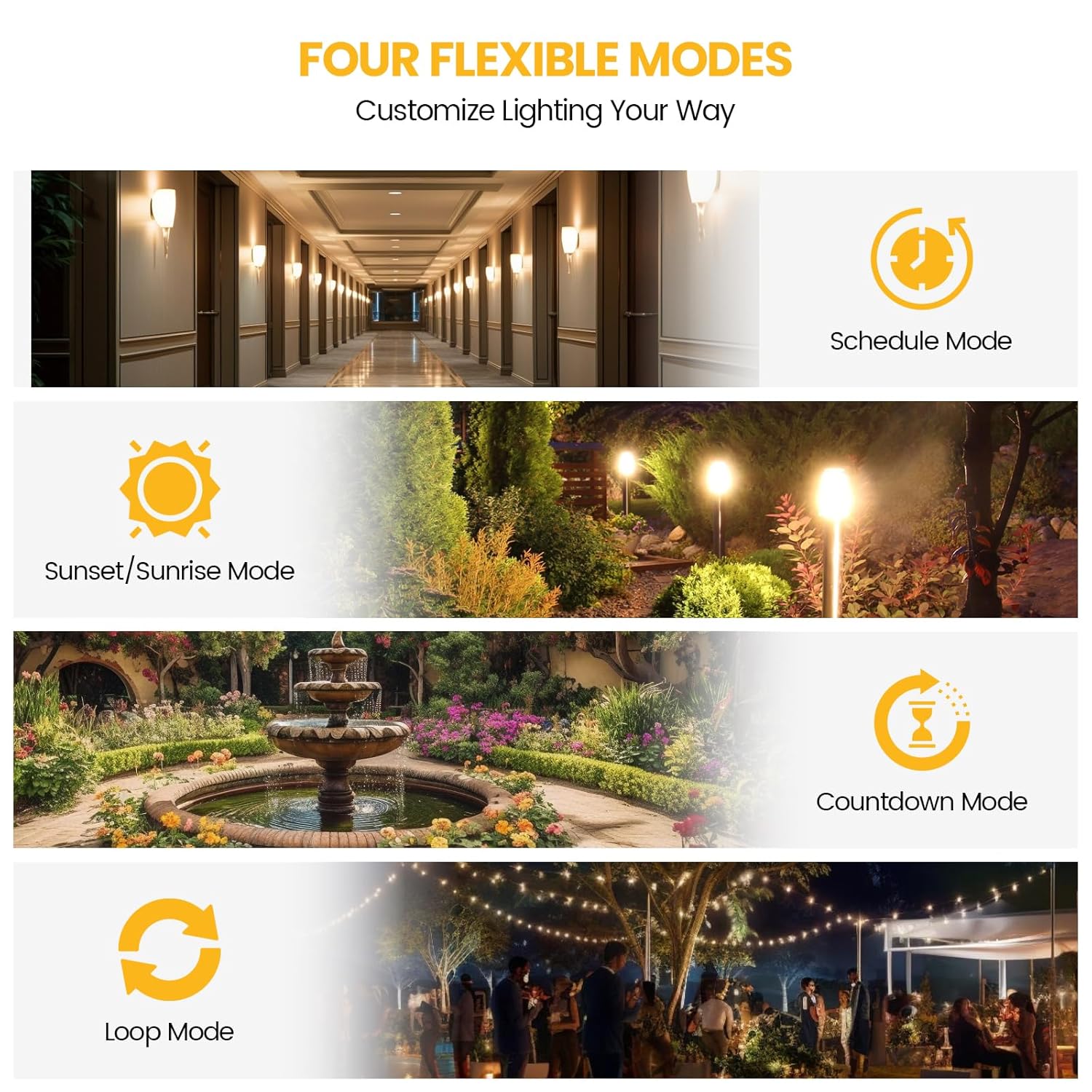 FLEXIBLE MODES: The scheduled mode is perfect for timed lighting in courtyards or corridors; the sunrise/sunset mode automatically adjusts based on natural light, ideal for outdoor landscape and garden lighting; the countdown mode offers precise control for courtyard water features and fountains; and the cycle mode provides dynamic changes for garden and decorative lighting, creating unique visual effects.