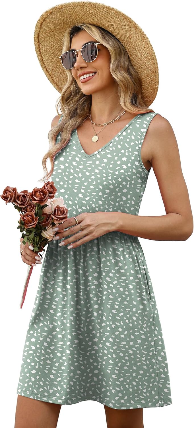 WIHOLL Women’s Summer Casual V Neck Sleeveless Tank Dress Pleated A-Line Beach Mini Sundresses Cover Up with Pockets