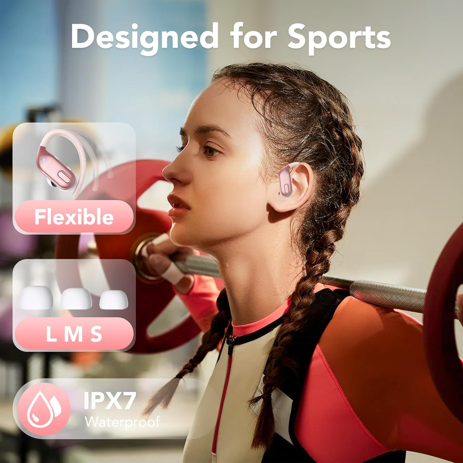 【Ergonomic Sports Design and IPX7 Waterproof】: The Wireless earbuds sport features ear hooks made of an innovative TPU (elastic) material that not only solves the problem of bluetooth earphones falling off when running, but is also comfortable to wear and anti-allergic. The earphones wireless bluetooth are equipped with nano-coated waterproof material, which can effectively prevent splash damage caused by sweat and raindrops, especially for jogging, gym, yoga and more sports.