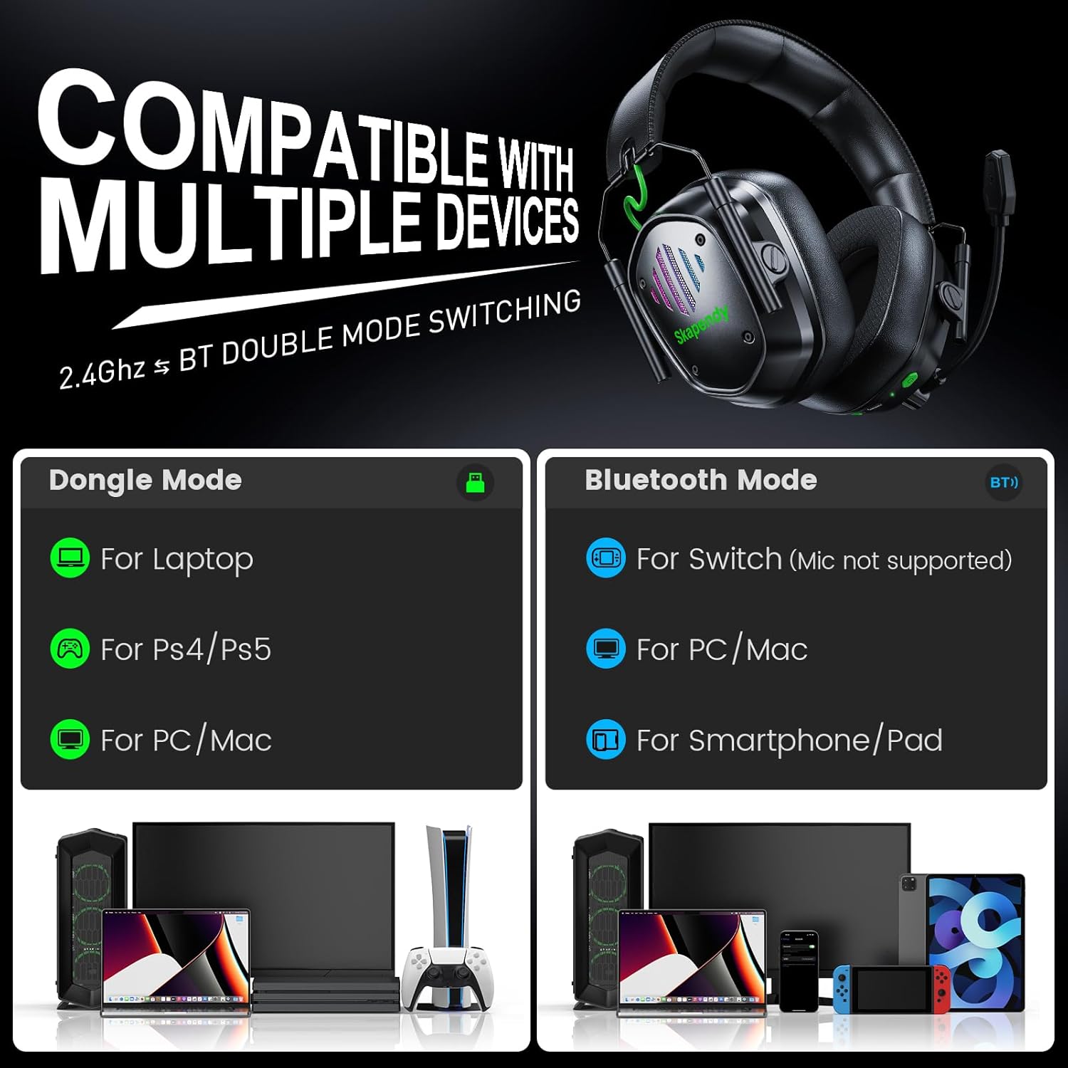 【🔄 Multi-Platform Compatibility】VK81 wireless headset for ps5 easily connects across multiple devices. 2.4GHz Dongle mode is Compatible with PS5, PS4, PC, and Mac. Bluetooth mode works with mobile phones, tablets, iPads, and other smart devices.⚠️ Not compatible with Xbox.⚠️ Bluetooth mode is not supported on PS4 or PS5.⚠️ Microphone function is unavailable when connected to Nintendo Switch.