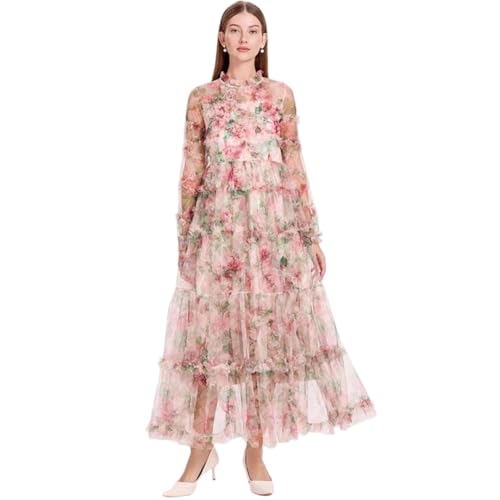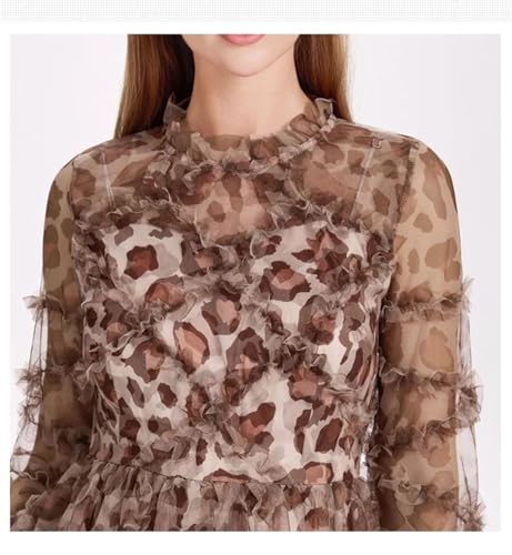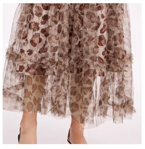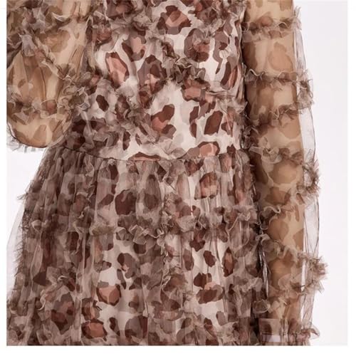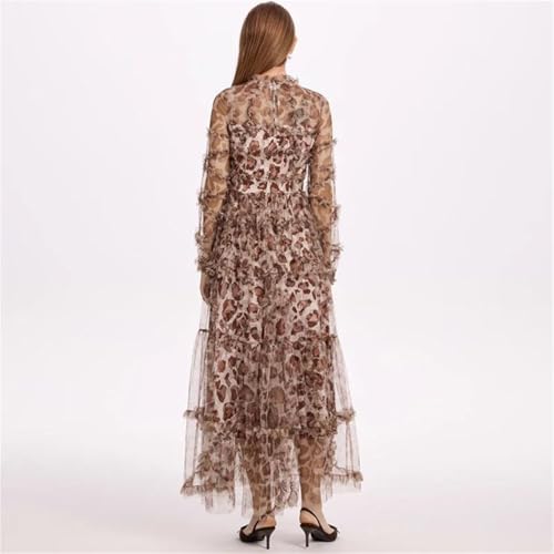 Women Print Crew Neck Dress Holiday Maxi Mesh Dress Women Ruffles Casual A Line Party Dresses Beige