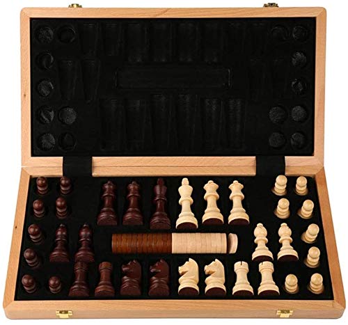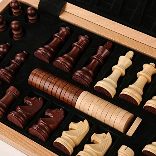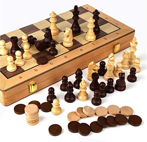 >Wooden Chess & Checkers Set: Dual functional 2 in 1 Chess Sets with board size 42cm*42cm when opened and 42cm*21cm when folded. Include 34 chess pieces(2 x Extra Queens) and 24 checker pieces. It’s convenient for indoor and outdoor use.