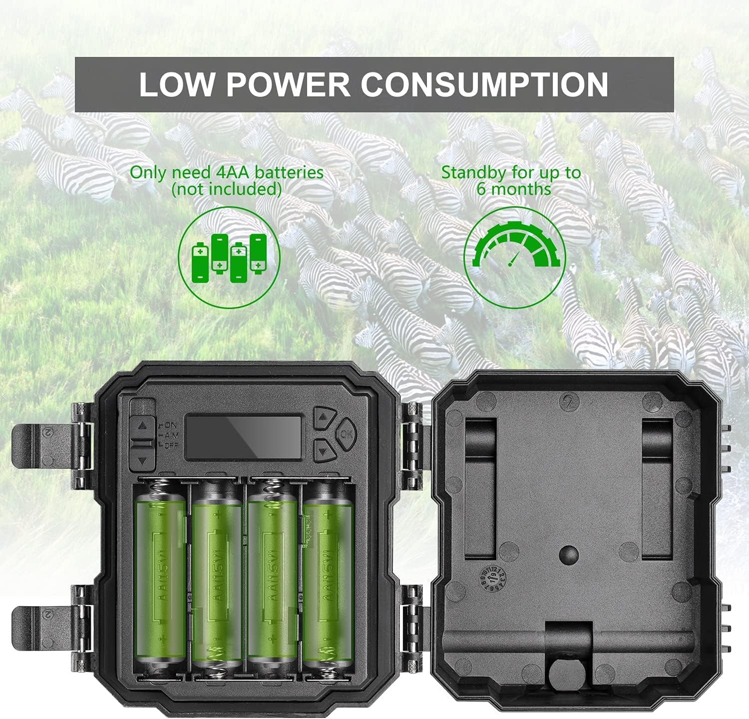 4pcs Batteries & Low Power Consumption: This new hunting trail camera only requires four batteries, reducing its weight and making it easy for you to carry outdoors. Additionally, its extremely low power consumption extends its battery life in standby mode.