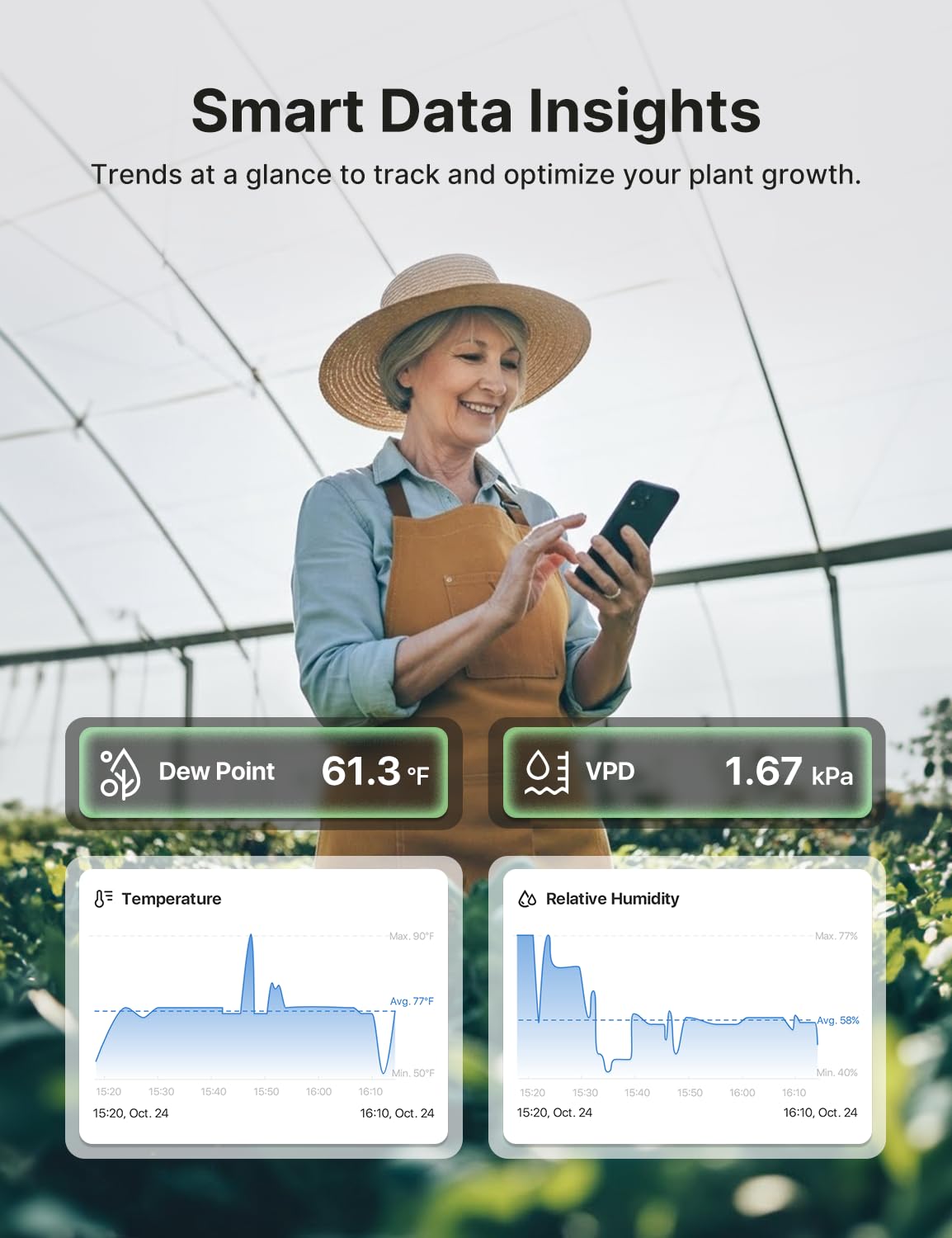 Smart App Insights: Its clear historical graphs allow you to check temperature, humidity, dew point, and VPD data at a glance—by day, month, or year; easily export your data to track trends, spot patterns, or optimize your environment