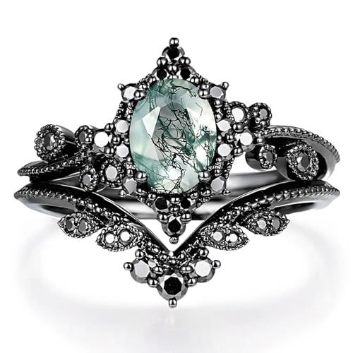 Yusaglow High-grade Vintage 2CT Oval Cut Nature Moss Agate Wedding Ring Set Gothic Moss Agate Women Bridal Ring Anniversary Jewelry Gifts Black Gold Plated S925 Silver,Style10,Size7