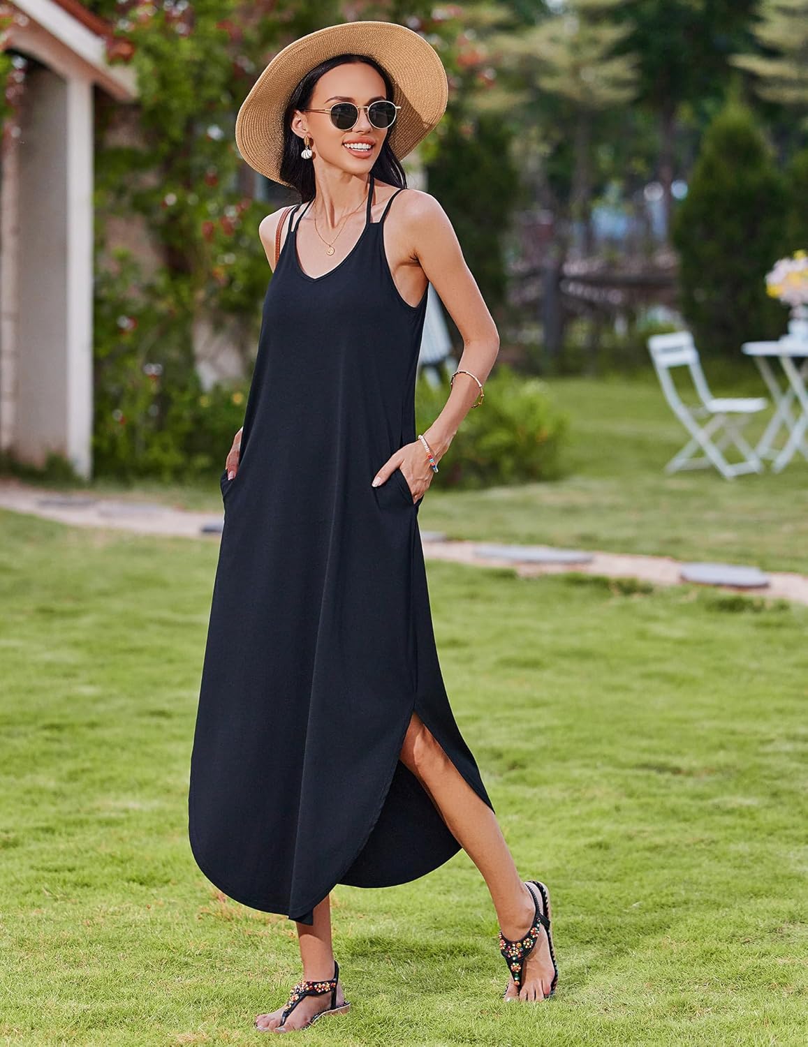 Zeagoo Women’s Casual Sundress Summer Maxi Sleeveless V Neck Split Boho Beach Dress Travel Vacation Dress with Pockets