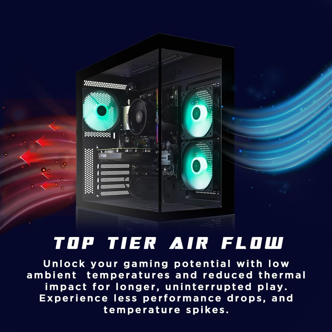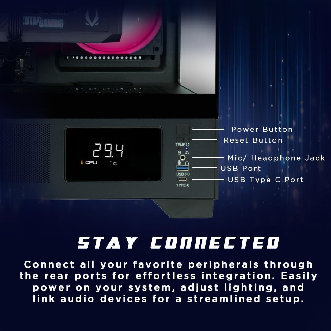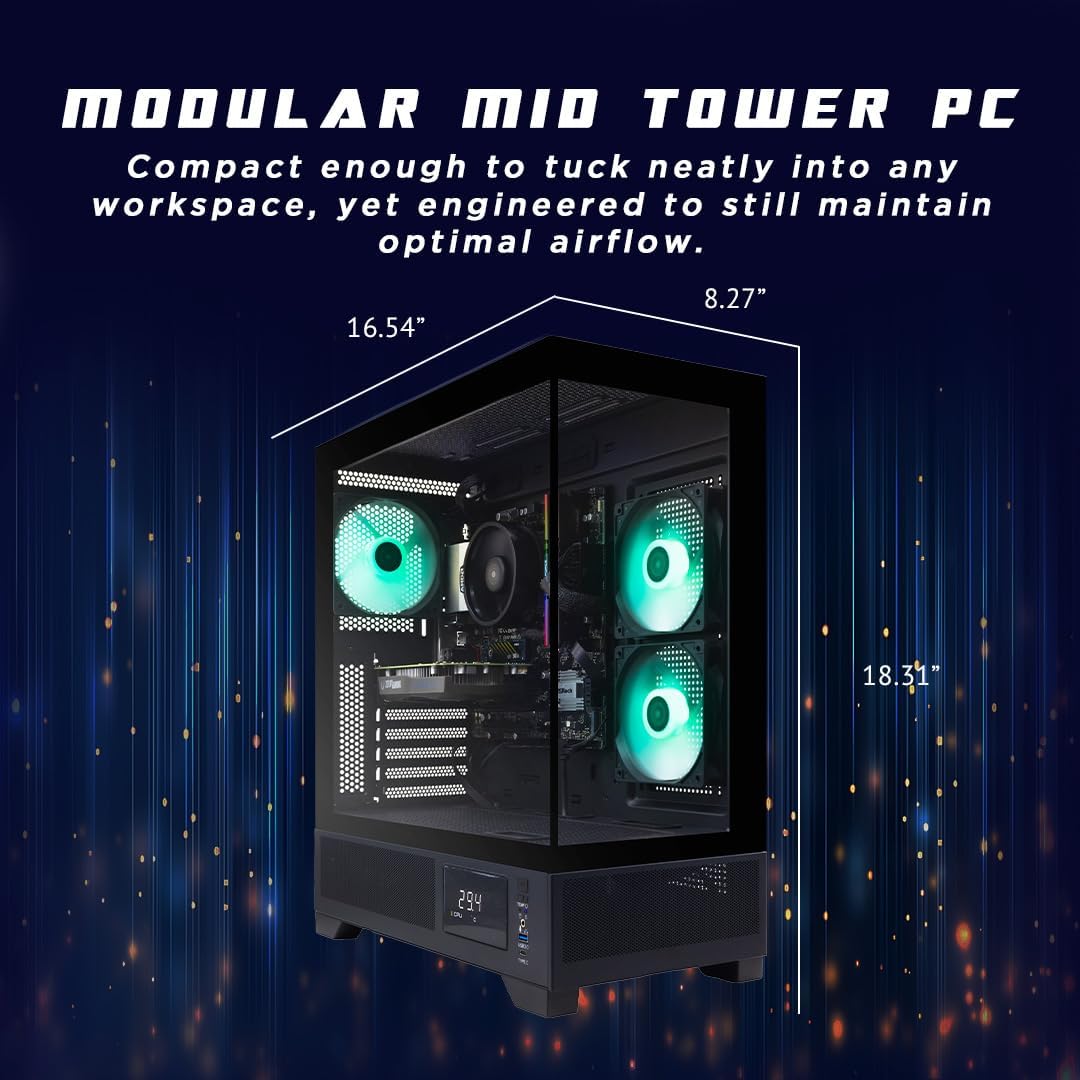 Perfect for all Gamers: weighing 21.35 lbs., MEK features a compact design, Seamless Tempered Glass Display, 120mm fans, easy-clean magnetic grill, and professional cable management for optimal airflow. Customized Monitor for System Information and Ambient Temperature.